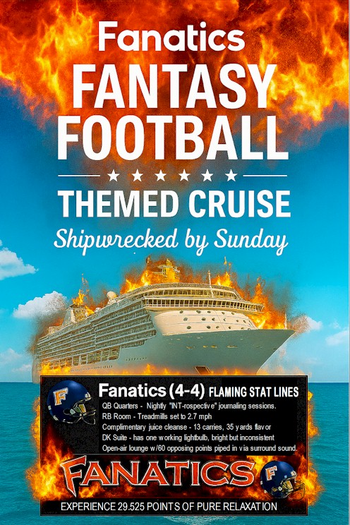 We are half way thru the season. So how is everbody looking? If the season ended today, here is what the playoffs would look like: One Seed Mr. Hoffnuts (1st round bye) Two Seed Roars to Riches (1st round bye) Three Seed Post Touchdown Stress Disorder Four Seed Romosexual Tendencies Fifth Seed Fanatics Six Seed BallBusters (wildcard based on most points scored remaining) Now let me go out on a limb, Roars to Riches and PTSD will drop to a bottom seed or fail to make the playoffs. That and a $1.99 will buy you and RC Cola. -- BomB OuT |